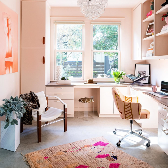 This dusty pink started out as a delicate wallpaper background that was often requested as a paint color. Pink Ground, with its heavy dose of yellow pigment, now creates the softest blush for a warm, calming finish that doesn't look sugary. Instead of contrasting with a bright white, try pairing with the warmer shade of Great White on the wood for a unique look in your home.