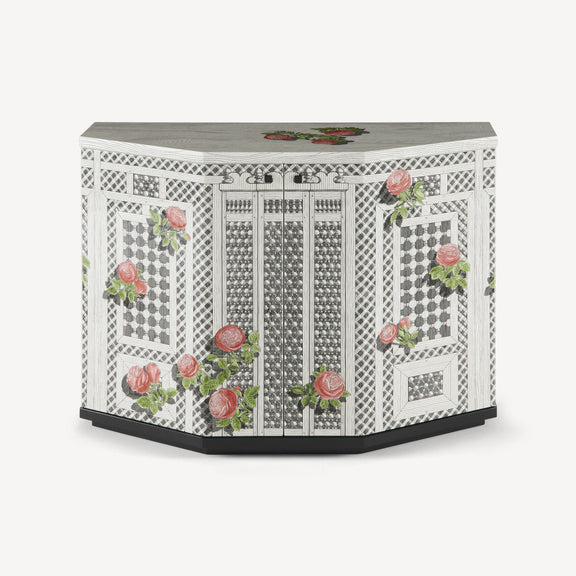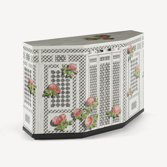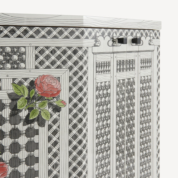 The new Fornasetti furniture and accessories for Milan Design Week 2023 feature polyhedral, lighter and more versatile designs that adapt and add personality to even the most intimate environments. In the Musciarabia con rose decor, intricate black and white geometric labyrinths are highlighted by hand-painted blooming roses.