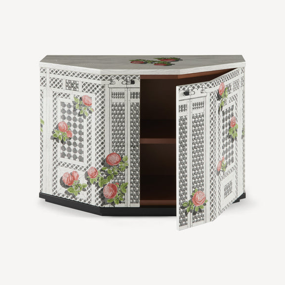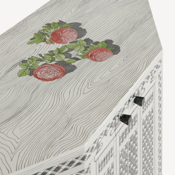 Each Fornasetti cabinet is unique and any small discrepancies between similar pieces are the result of artisanal production processes. The top of this Fornasetti piece is completely decorated by hand and includes the protective glass.