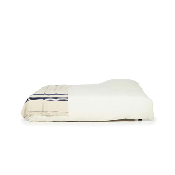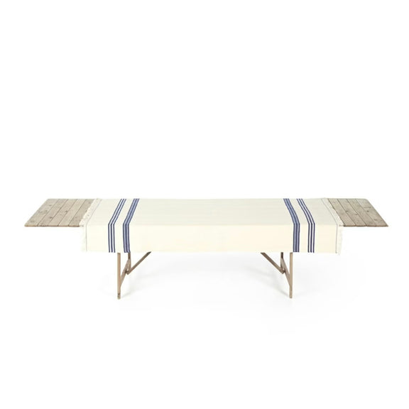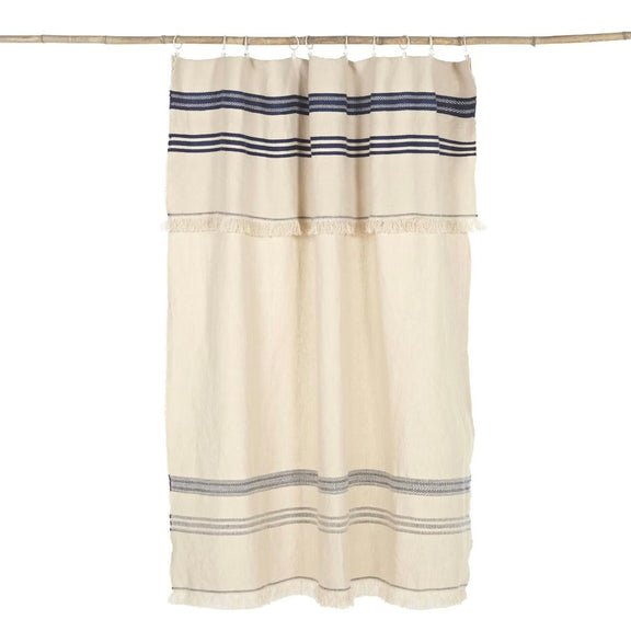 Uma peça de linho com listras azul-índigo sobre um fundo branco-sujo de trama simples — um item básico e versátil para decoração de casa, arranjos de mesa, cortinas ou para combinar com outras peças de linho.
