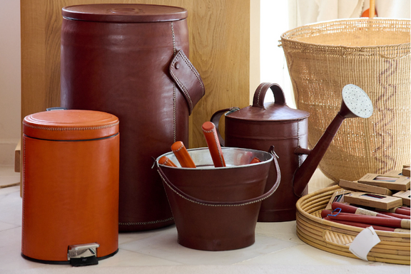 This Trash Bucket is part of a limited collection of leather-covered everyday utensils.