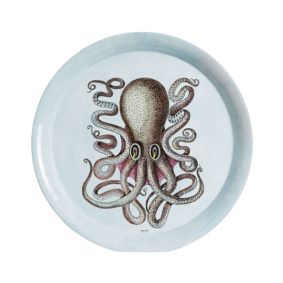A forma circular e a superfície plana dão grande destaque às decorações do Atelier. Esta bandeja decorada à mão com detalhes dourados é embelezada com a misteriosa silhueta de um polvo, um testemunho do amor de Fornasetti por temas zoomórficos. Combinada com um suporte dobrável, a bandeja pode ser transformada em uma mesa de café.