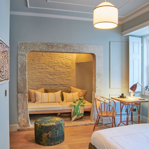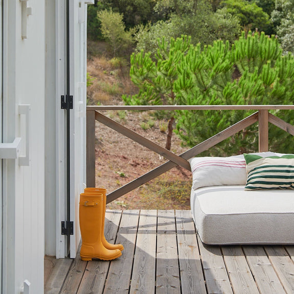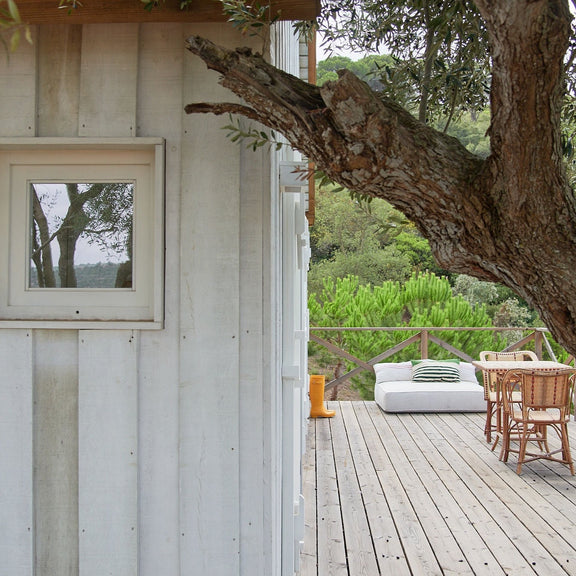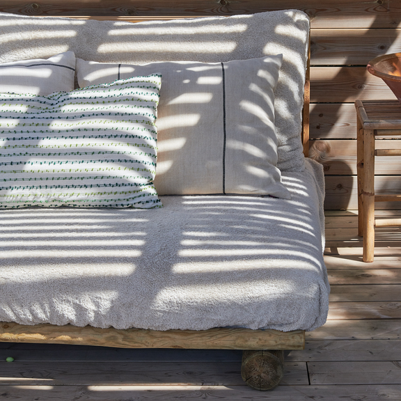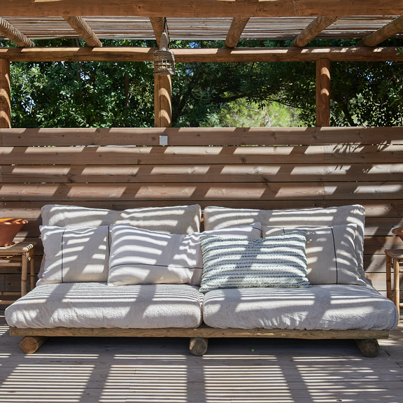 Two-seat chill out made of cushions with Abyss cover. The sofa is mounted on a wooden structure. Available for indoor and outdoor areas.