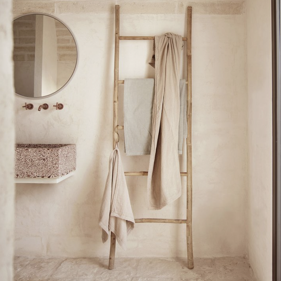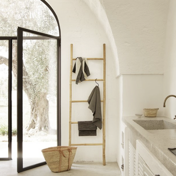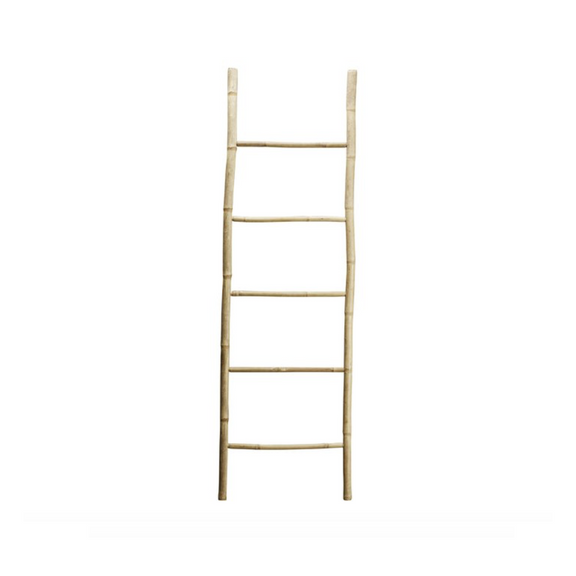 Bamboo stairs are a simple and smart way to create storage in the room. We use our iron hooks to hang towels and dishcloths in the bathroom and kitchen. The ladder can also be used with a light chain to create a cozy light in the bedroom or on the terrace.