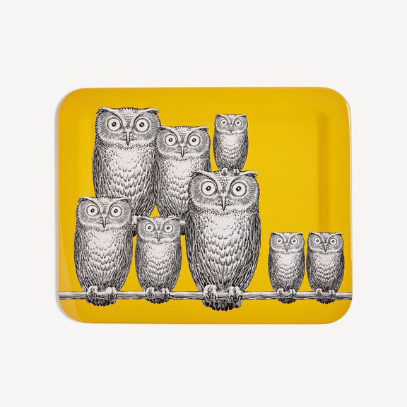 The tray, with its surface similar to a sheet of paper, is the complement that best suits the Atelier's decor. This hand-screen printed, painted and varnished creation is embellished with the design of owls, an animal that symbolizes foresight. Combined with a folding stand, the tray can be transformed into a coffee table.
