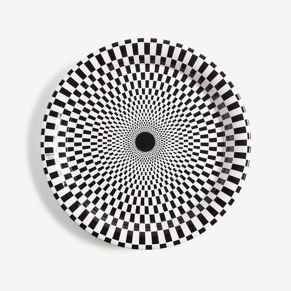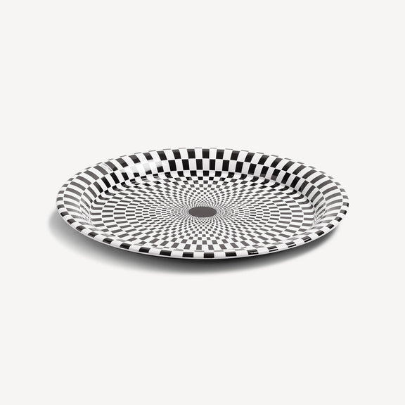 The circular shape and flat surface give great emphasis to the Atelier’s decoration. This hand-decorated tray catches the eye with a hypnotic design. Combined with a folding stand, the tray can be transformed into a coffee table.