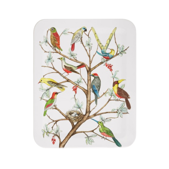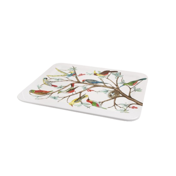 The tray, the closest thing to a sheet of paper in shape and surface, has always offered Fornasetti great expressive possibilities. This hand-screenprinted, painted and lacquered model is inspired by old encyclopedias in its depiction of colorful birds. Combined with a folding stand, the tray can be transformed into a coffee table.