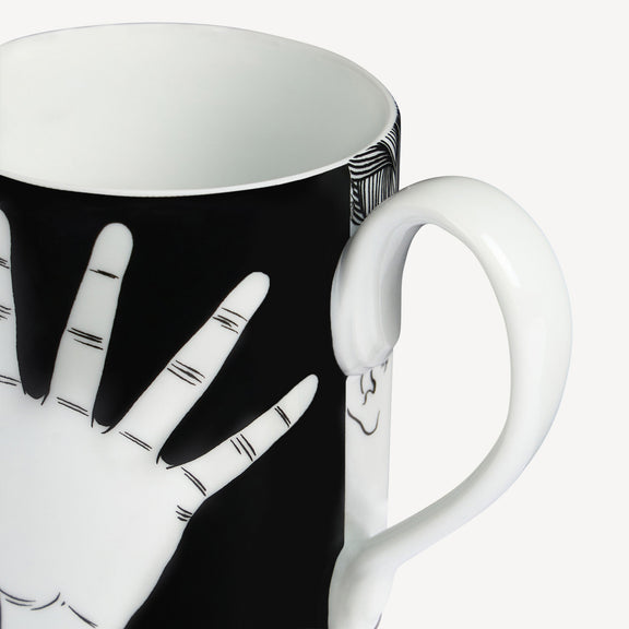 Fornasetti interpreta a mão, o arquétipo do artista, tanto como ferramenta criativa como padrão para os objetos criados. Mãos que seguram lápis, usam joias, apanham borboletas ou troçam com um gesto brincalhão de polegar, revestem a nova coleção de porcelana fina. Estas peças são concebidas para enriquecer a mesa, armazenar papéis ou pequenos artigos, ou ser expostas como elementos puramente decorativos.