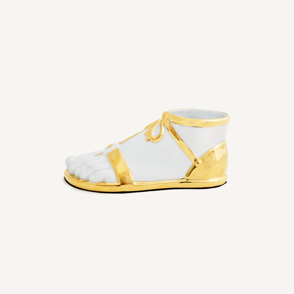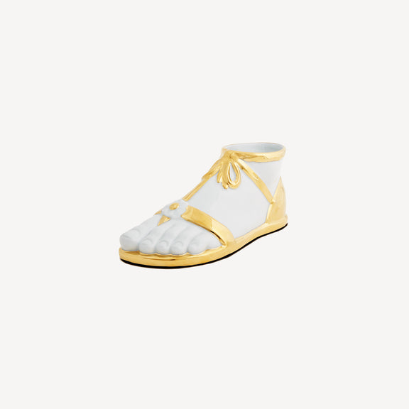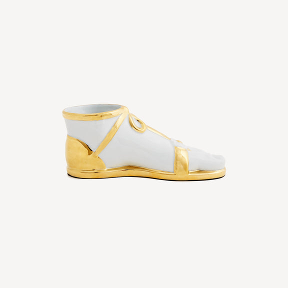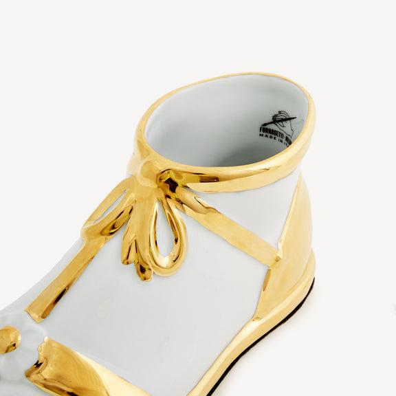 Fornasetti's love of classic aesthetics inspired this hand-decorated porcelain pencil holder with gold accents: a collector's piece that will add an irreverent touch to your table.