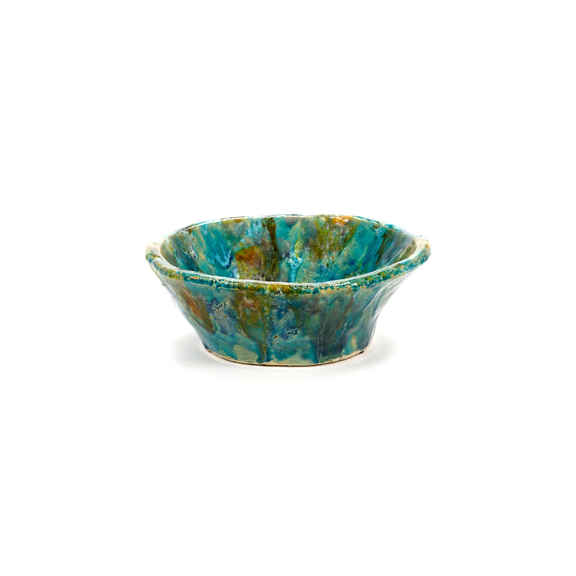 This Sienna clay bowl brings travel stories to your table. The mix of blues and greens and the robust design of the bowl give it an authentic look.