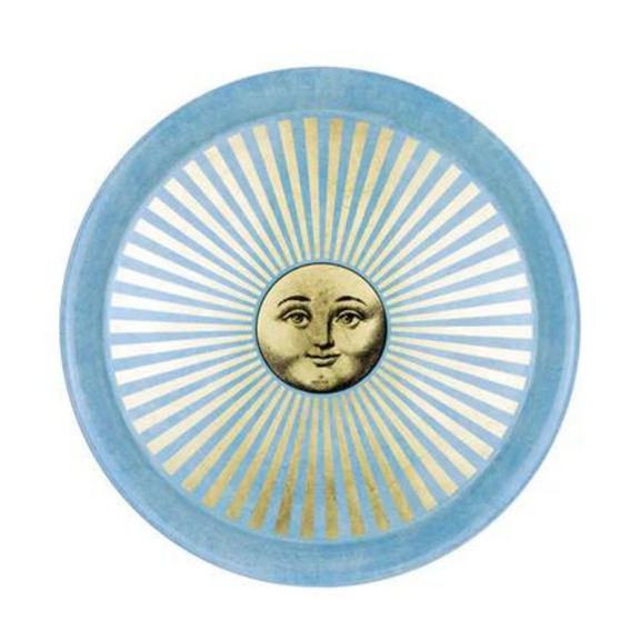 A forma circular e a superfície plana conferem grande destaque às decorações do Atelier. Esta bandeja decorada à mão com detalhes em ouro chama a atenção com um design hipnótico irradiando de um sol antropomórfico. Combinada com um suporte dobrável, a bandeja pode ser transformada em uma mesa de centro.