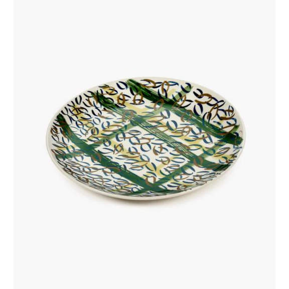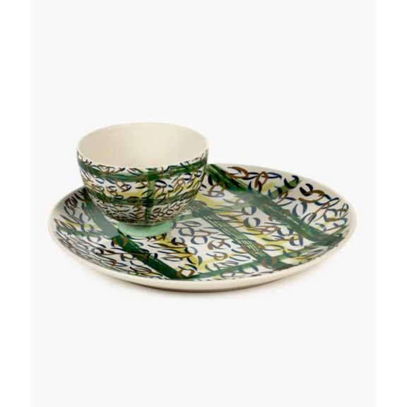 Os pratos de Bela Silva são uma homenagem aos piqueniques em prados relvados, às flores e ao céu azul. Os azuis e verdes e os padrões contribuem para o aspeto alegre desta loiça de barro.