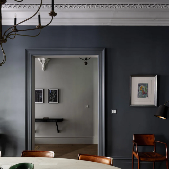 Down Pipe, a dark lead gray, has defined blue tones that deepen the complexity of the finish. Originally inspired by the color used to paint pipes and gutters, it was adopted for use indoors with fanatical zeal! This bold, dark tone is fabulous as a backdrop for art and extremely effective for use in hallways to create a deeply dramatic entry into the home.