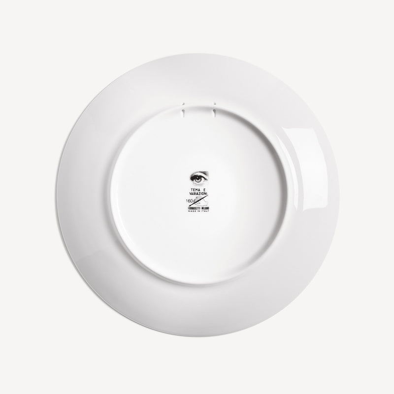 The unmistakable features of Lina Cavalieri's face, playfully reinterpreted by Fornasetti, serve as inspiration for the Tema e Variazioni series, to which this hand-decorated porcelain plate belongs. A true collector's item, you can use this creation as a wall plaque, thanks to the two holes on the back, but also as an ornamental piece for table art. For cleaning, we recommend a damp cloth without soap or solvents.