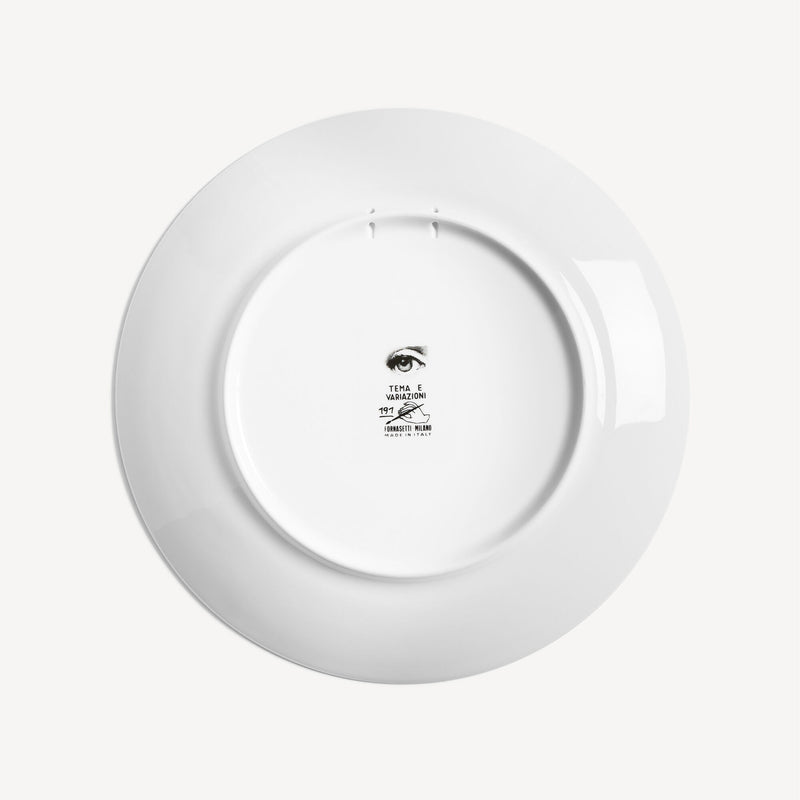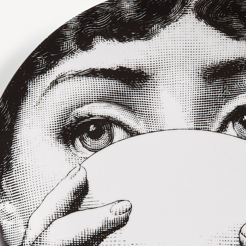 The face of opera singer Lina Cavalieri, reinterpreted by Piero Fornasetti, adorns this hand-decorated porcelain plate from the iconic Tema e Variazioni series. A real collector's item, you can use it as a wall plaque thanks to the two holes on the back, but also as an ornamental plaque for table art. For cleaning, we recommend a damp cloth without soap or solvents.