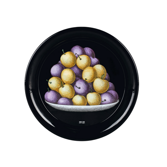 É o objeto Fornasetti por excelência e, para a Semana de Design de Milão, a coleção de bandejas Fornasetti é enriquecida com novas variações e reedições dos modelos vintage originais da década de 1950, como esta bandeja redonda, cujo design Prugne pintado à mão traz uma combinação de cores sofisticadas e padrões elegantes para a sala de jantar Fornasetti.
