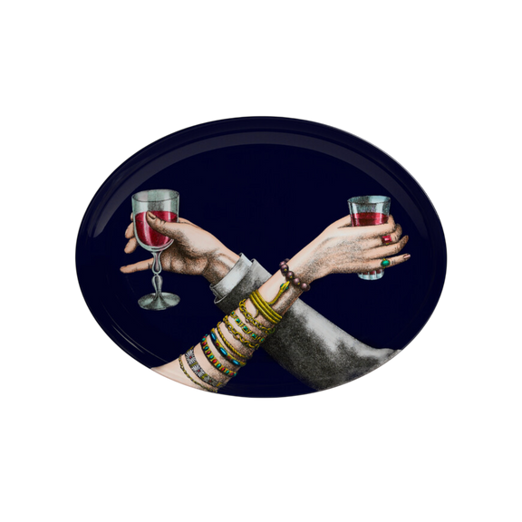 Bandeja oval na cor Brindisi sobre fundo azul.