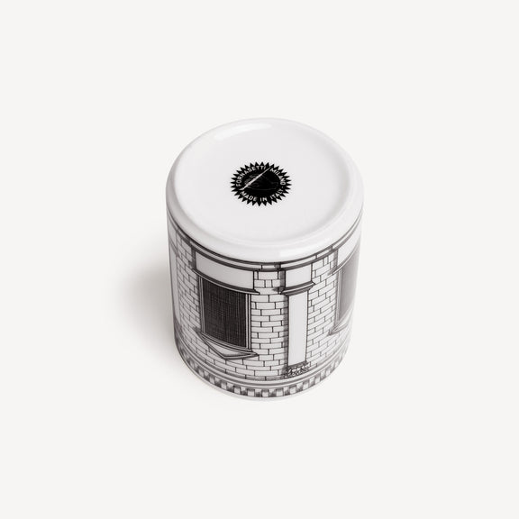 O tema arquitetónico reveste este porta lápis de porcelana decorado à mão, transferindo a imagem de Fornasetti para um objeto do quotidiano, transformando-o num item de colecionador.