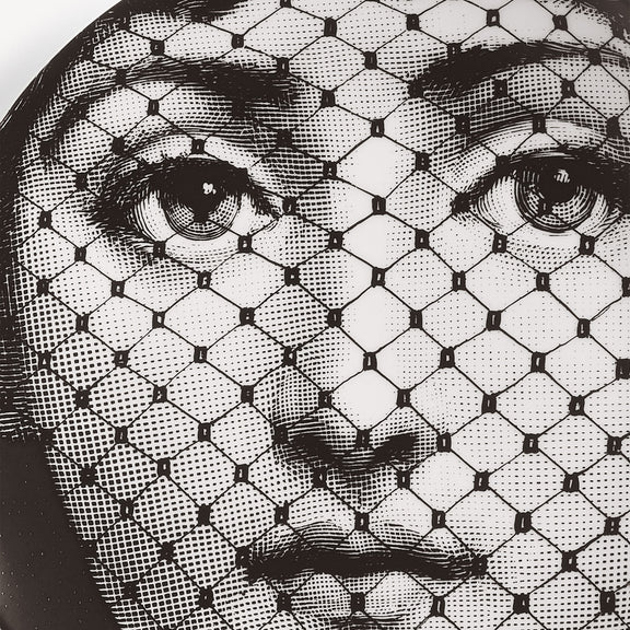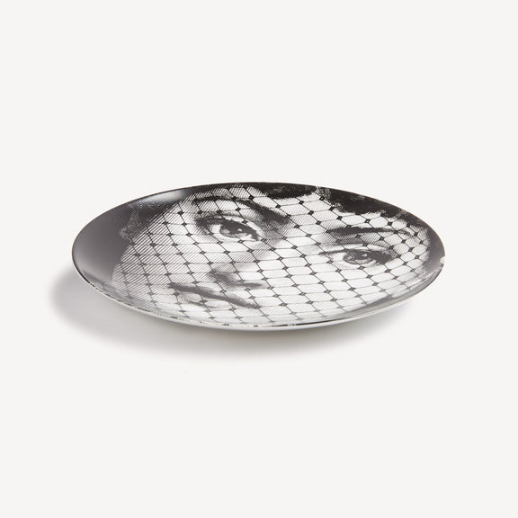 As reinterpretações de Fornasetti do rosto da cantora de ópera Lina Cavalieri dão vida à icônica série "Tema e Variazioni" e fazem deste prato de parede de porcelana um item obrigatório para colecionadores e amantes da arte.