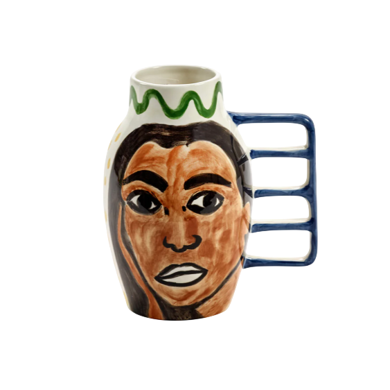 Este vaso de cerâmica pintado à mão por Shirley Villavicencio Pizango combina arte e funcionalidade de forma lúdica. As pinceladas ousadas e a alça escultural ecoam a energia de suas pinturas e as cores de suas raízes amazônicas. Com diferentes ilustrações em cada lado, ele traz vivacidade e emoção a qualquer ambiente.