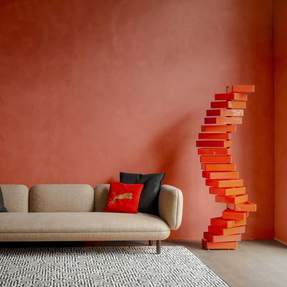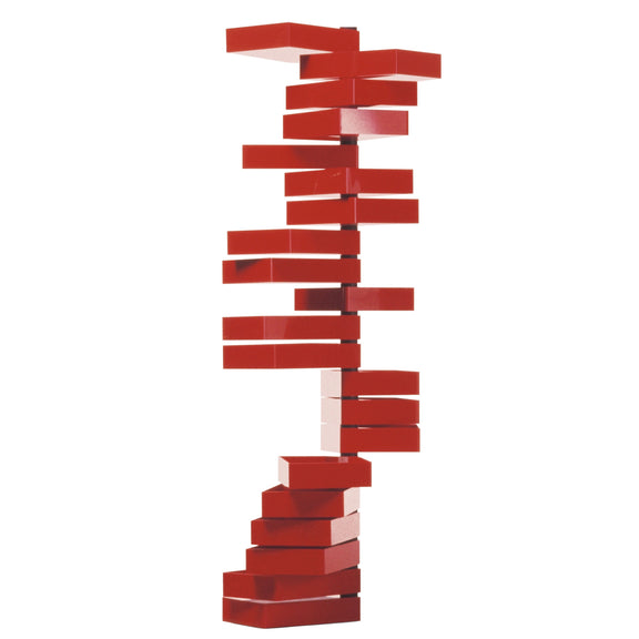 O Gabinete Giratório é feito de material plástico acrílico vermelho brilhante e está equipado com 20 gavetas que giram em torno de um suporte vertical de metal.