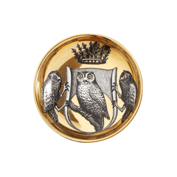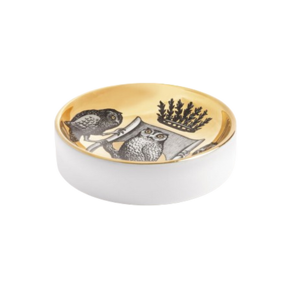 Um símbolo de sabedoria e perspicácia, a coruja sempre estimulou a imaginação de Fornasetti: aqui ela é a protagonista deste cinzeiro de porcelana decorado à mão com detalhes em ouro.