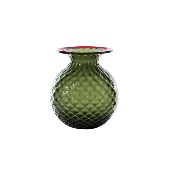 Parece macio, mas é de vidro.A ilusão de ótica está expressa em seu nome: Balloton, a tradicional técnica de sopro de vidro que recria o aspecto matelassê na superfície. Uma borda fina em cor contrastante trabalhada a quente ao redor da boca do vaso mostra o estilo característico da vidraria.