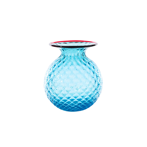 Parece macio, mas é de vidro.A ilusão de ótica está expressa em seu nome: Balloton, a tradicional técnica de sopro de vidro que recria o aspecto matelassê na superfície. Uma borda fina em cor contrastante trabalhada a quente ao redor da boca do vaso mostra o estilo característico da vidraria.