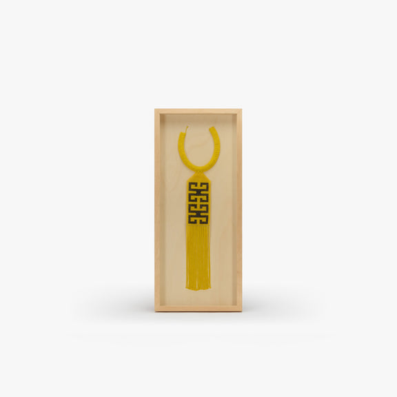 Colar indígena amarelo com grafismo a preto, emoldurado em madeira.