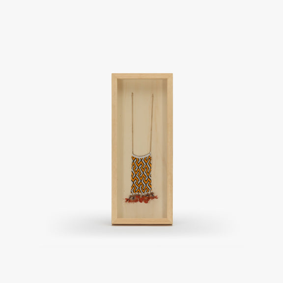 Colar indígena em tons de marrom, emoldurado em madeira.