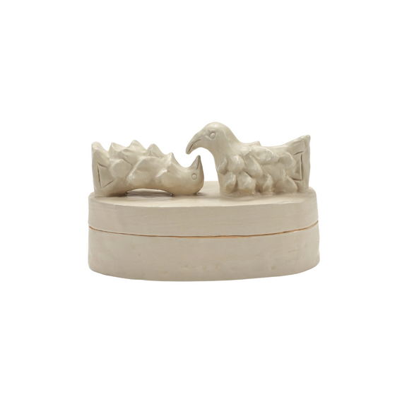 A vela perfumada 'Encensoir' da Bela Silva mistura os aromas calmantes de cravo, gerânio e flores brancas. O pote, completo com tampa, reflete o toque característico da artista, servindo tanto como uma peça decorativa quanto como um recipiente funcional para armazenar pequenos objetos de valor.