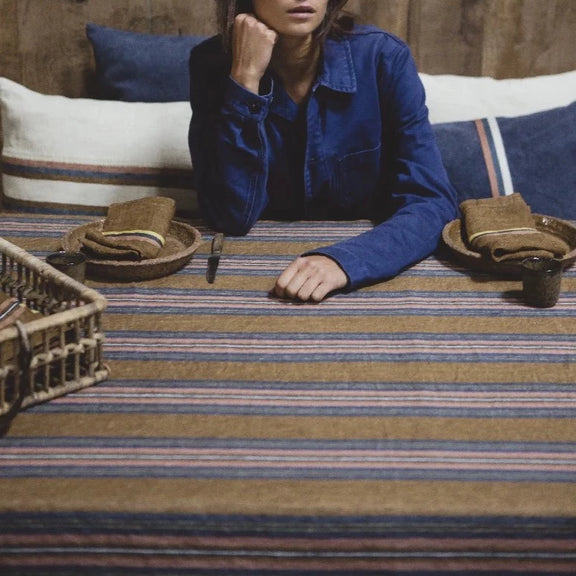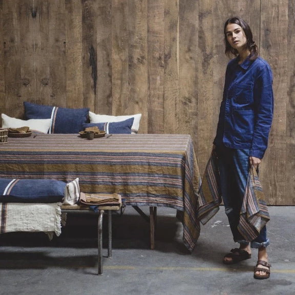 Esta é a nossa coleção clássica de roupa de mesa às riscas, num design básico mas de verão. É uma faixa completa em azul marinho, rosa velho, mostarda e areia branca sobre um solo bronze de Nairóbi. Acabamento lavado.