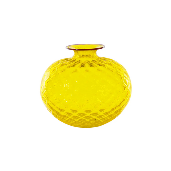 Parece macio, mas é de vidro.A ilusão de ótica está expressa em seu nome: Balloton, a tradicional técnica de sopro de vidro que recria o aspecto matelassê na superfície. Uma borda fina em cor contrastante trabalhada a quente ao redor da boca do vaso mostra o estilo característico da vidraria.