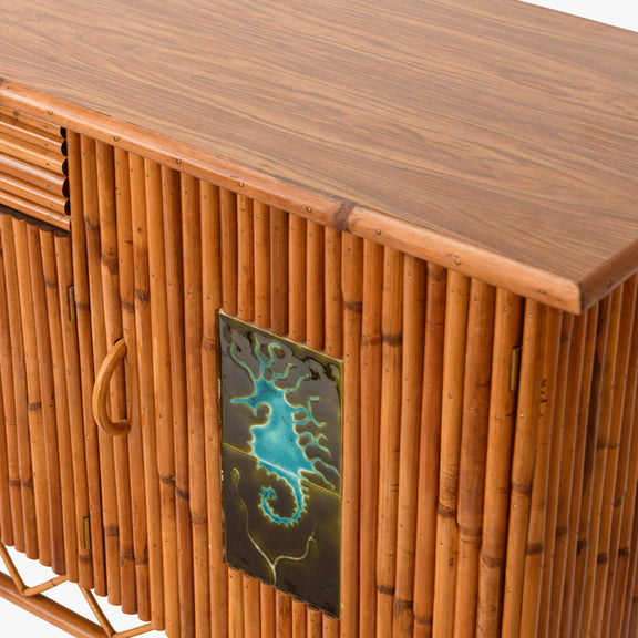 Aparador Vintage de bambú com painel de azulejo, porta de armário e gaveteiro.