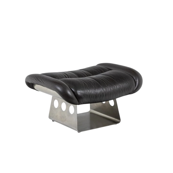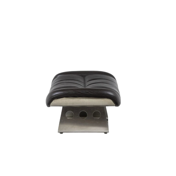 Banqueta Vintage em metal e couro. Década de 1970, RIMA, Itália. Pele na cor chocolate. Pés e encosto em aço inoxidável escovado.