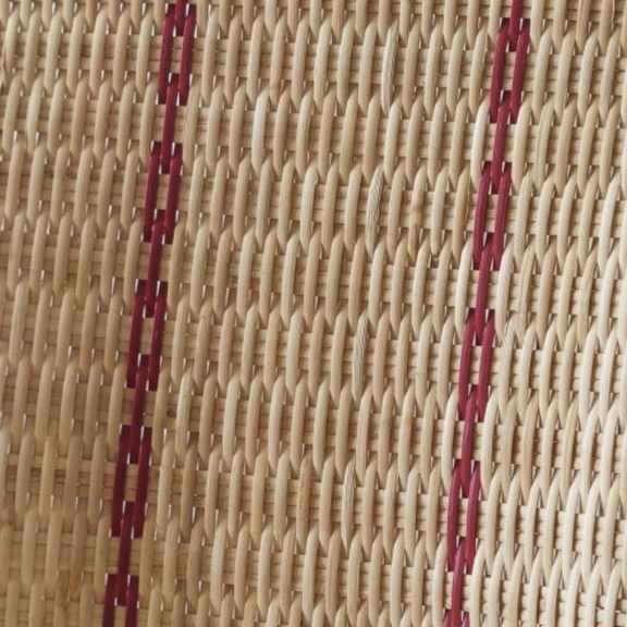 Estrutura em rattan escuro natural não descascado, tecelagem em rattan patinado e resina HDPE (secções vermelhas), estrutura do assento em madeira maciça com correias. Verniz acetinado à base de água.