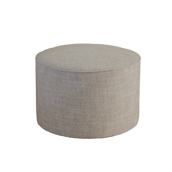Pouf redondo rijo com base de madeira revestido com tecido da marca Pierre Frey.