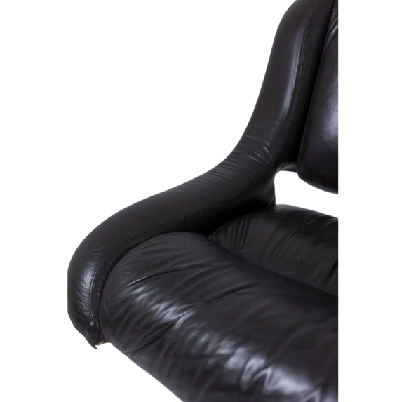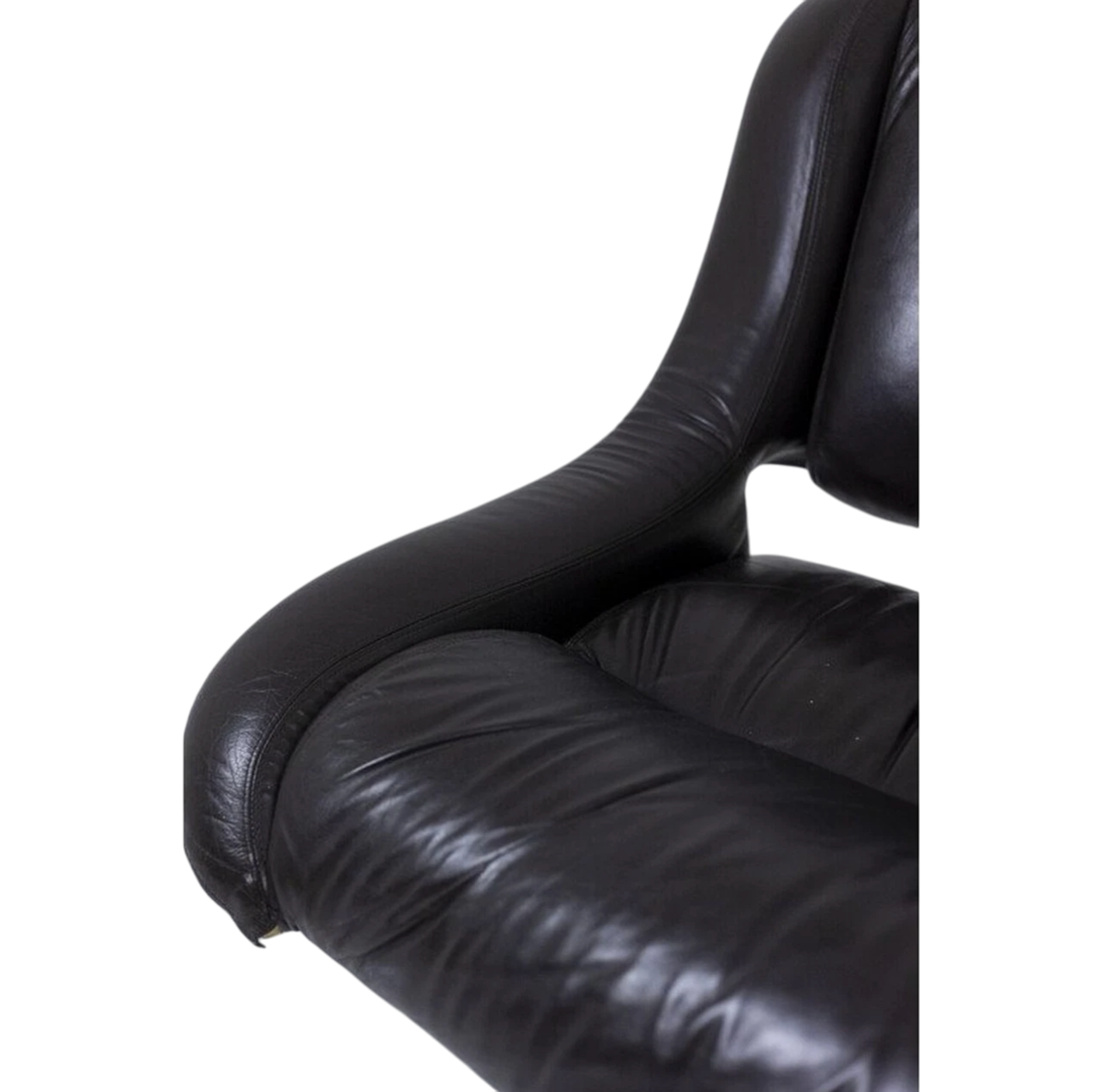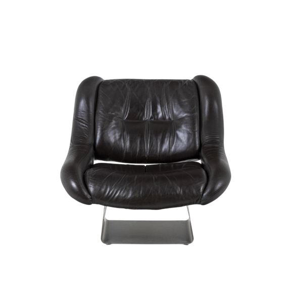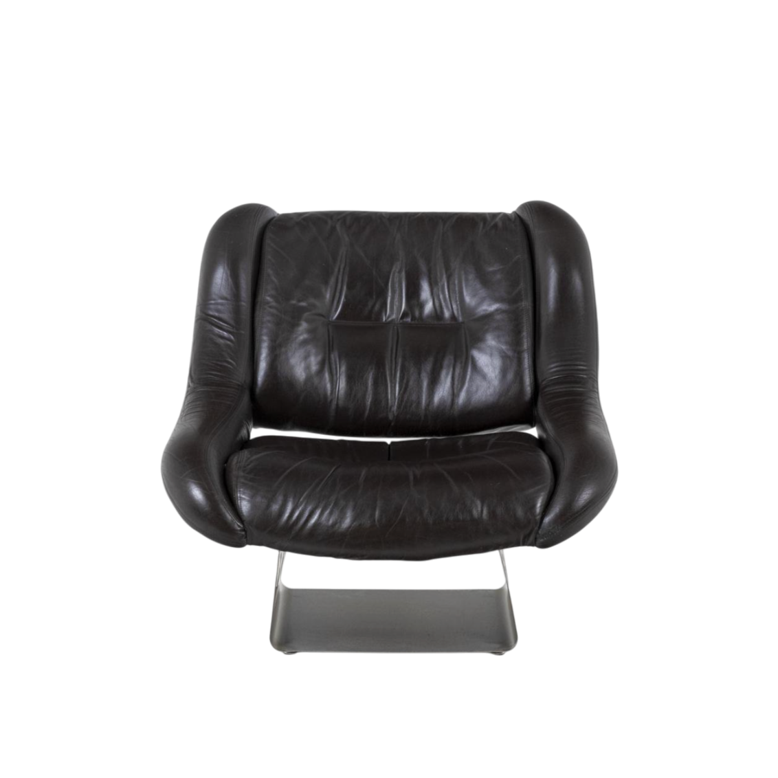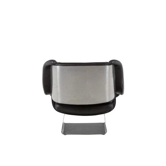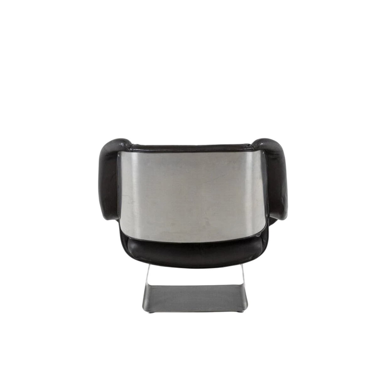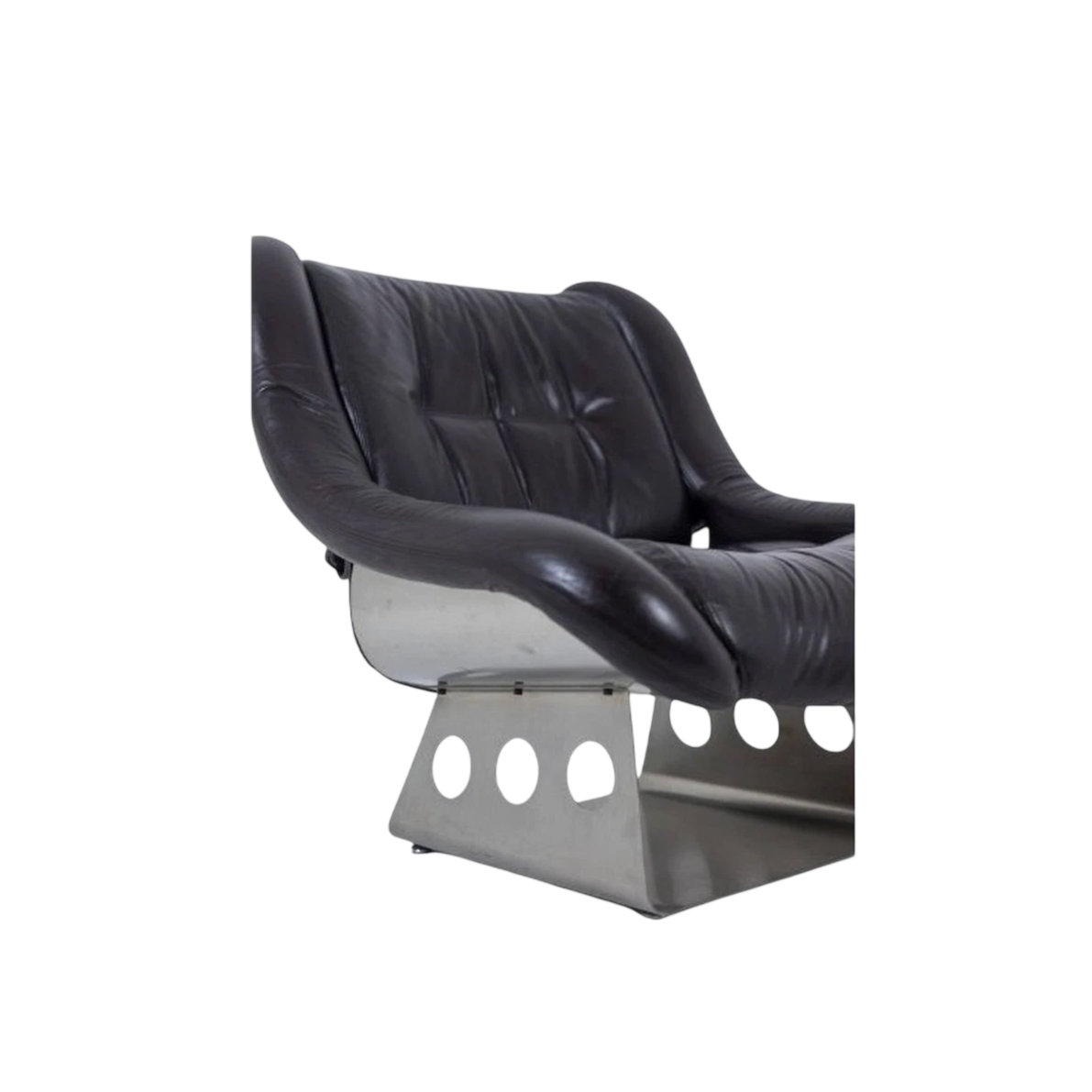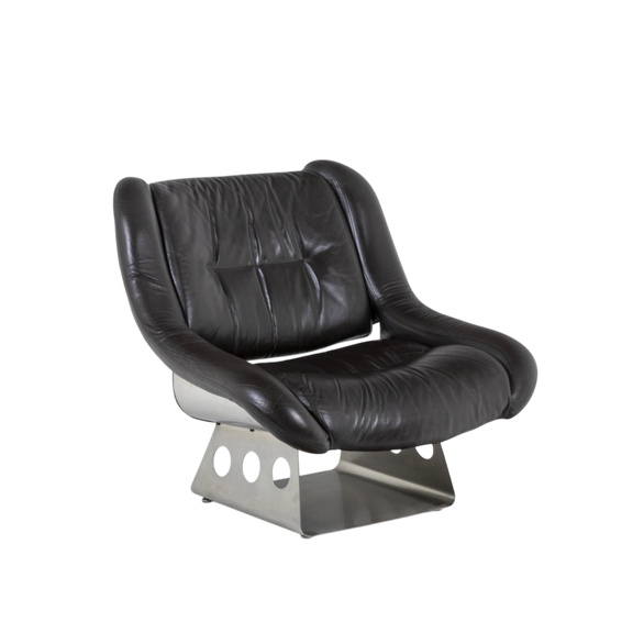 Poltrona Vintage em metal e couro. Década de 1970, RIMA, Itália. Pele na cor chocolate. Pés e encosto em aço inoxidável escovado.