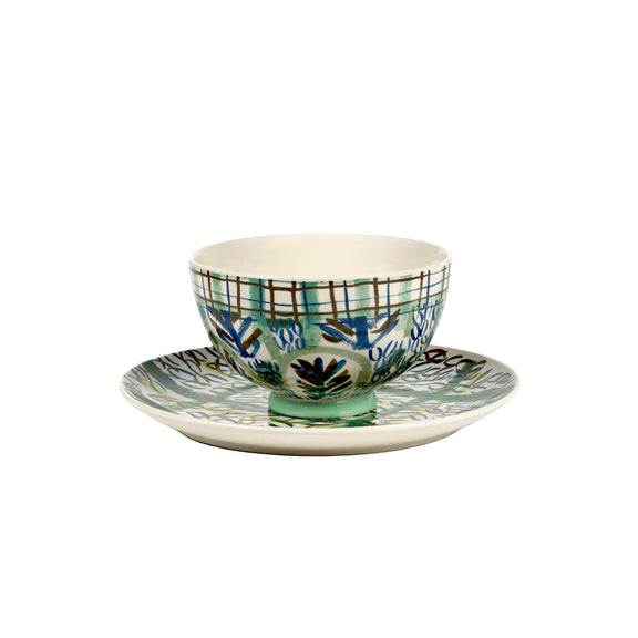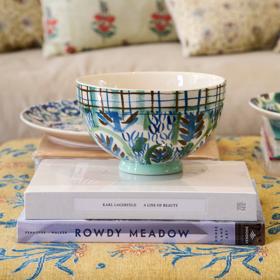 As tigelas de Bela Silva homenageiam os piqueniques em prados relvados, com flores e um céu azul celeste. A combinação animada de azuis e verdes com padrões acrescenta um toque alegre a esta louça de cerâmica.