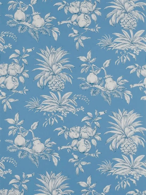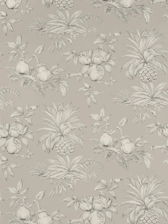 Desenho de pena representando frutas exóticas no estilo Toiles de Jouy. Papel de parede impresso à mão em moldura. Sem acabamento. Boussac - Faune & Flore - Papiers Peints.