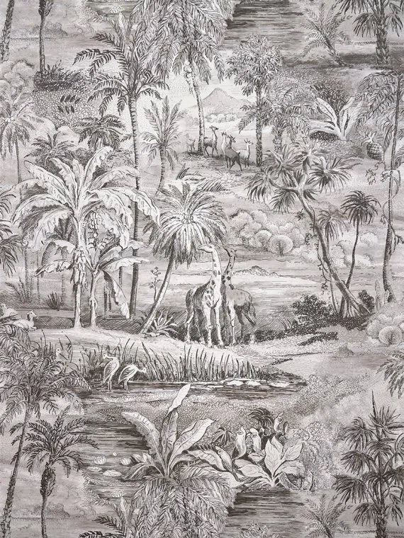Com um toque de grisalha moderna, este desenho é executado com caneta hidrográfica. Os mil detalhes desta vegetação luxuriante ilustram girafas, grous e gazelas, de forma contemporânea e delicada, descansando pacificamente. Disponível em tecido sob a referência. Pierre Frey - Desertos
