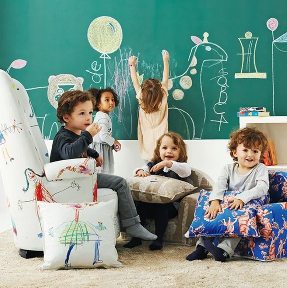 Esta estampa de algodão, desenhada por Gaël Davrinche, um artista contemporâneo que se esforça para evocar a inocência da infância em suas criações, consiste em múltiplas figuras multicoloridas grosseiramente esboçadas.