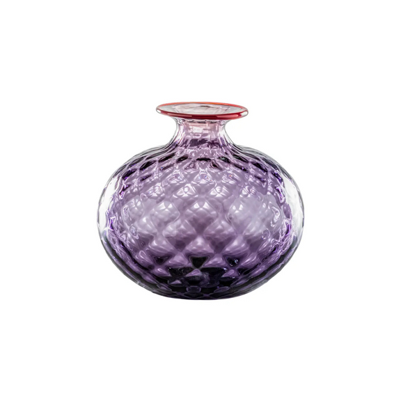 Parece macio, mas é de vidro.A ilusão de ótica está expressa em seu nome: Balloton, a tradicional técnica de sopro de vidro que recria o aspecto matelassê na superfície. Uma borda fina em cor contrastante trabalhada a quente ao redor da boca do vaso mostra o estilo característico da vidraria.