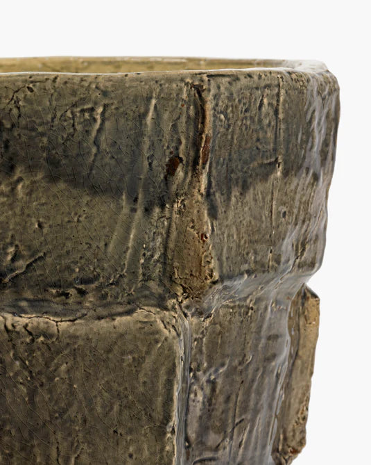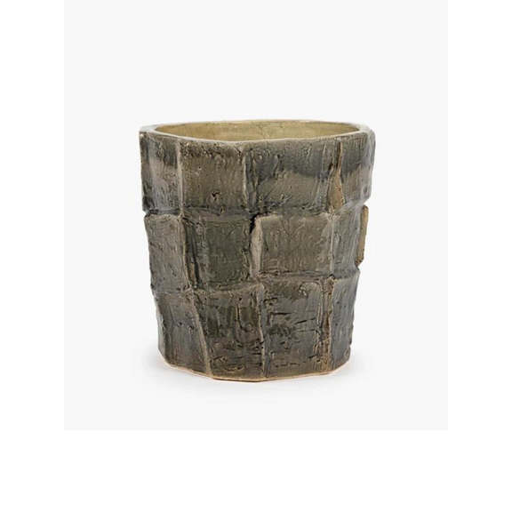 O vaso de flores cinzento-escuro de Bela Silva mistura formas geométricas com um relevo repetido em relevo para uma vibração minimalista. Para preservar a integridade do design, não foi adicionado qualquer orifício na base do vaso.