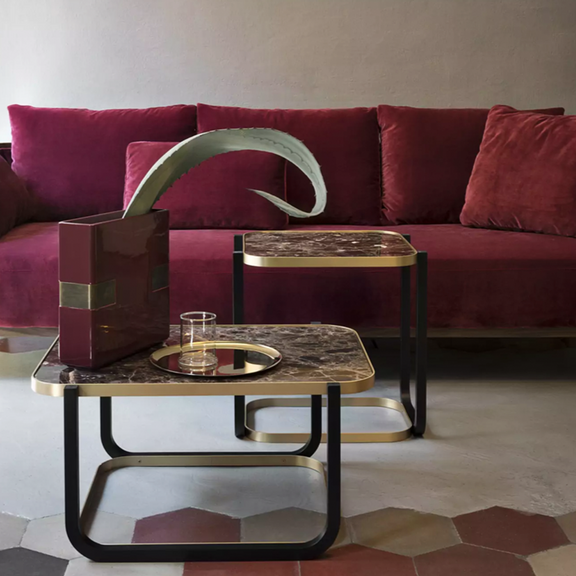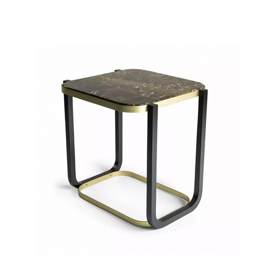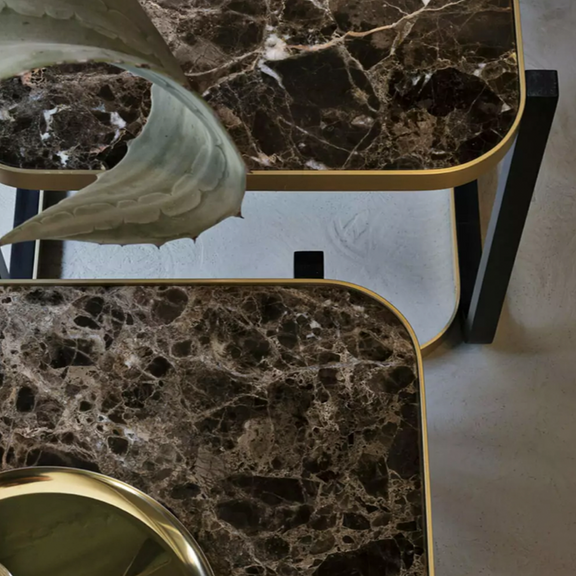Mesa de centro com estrutura em aço latão e madeira de faia dobrada de secções quadradas. Tampo em mármore “Imperador Brown”.
