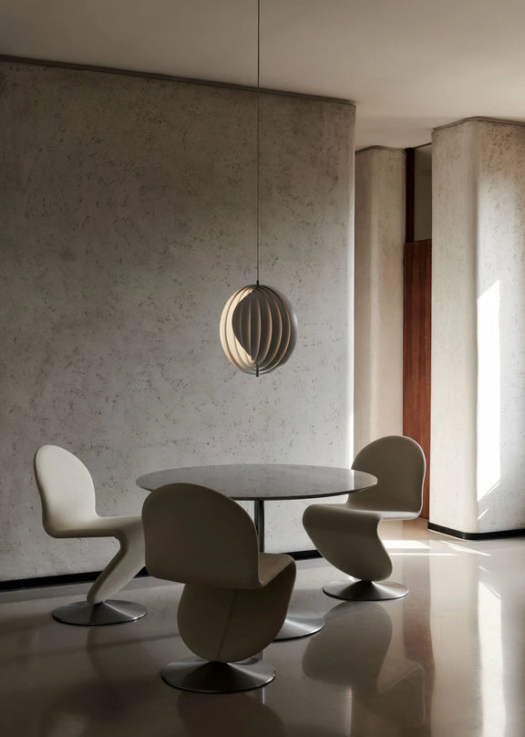 Desenhado em 1960, o Moon representa um dos primeiros designs de iluminação de Verner Panton. O icônico pendente é caracterizado por seu design em forma de leque com dez lamelas em forma de anel perfeitamente posicionadas para fornecer uma luz suave, ambiente e sem brilho. As lâminas refletem e filtram a luz, e o pendente muda sua aparência dependendo do ângulo de visão.