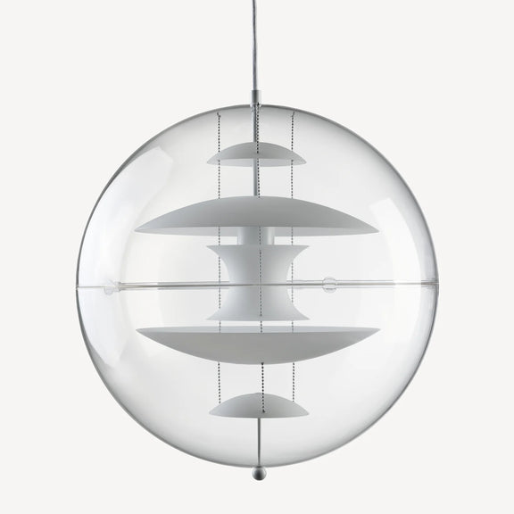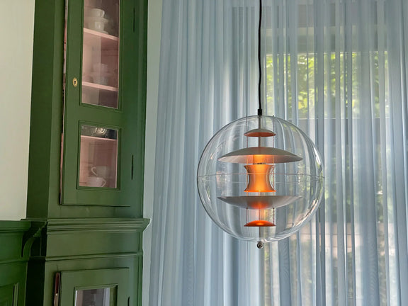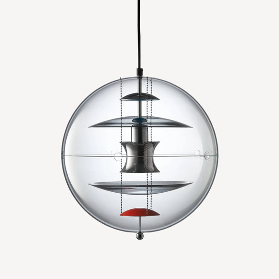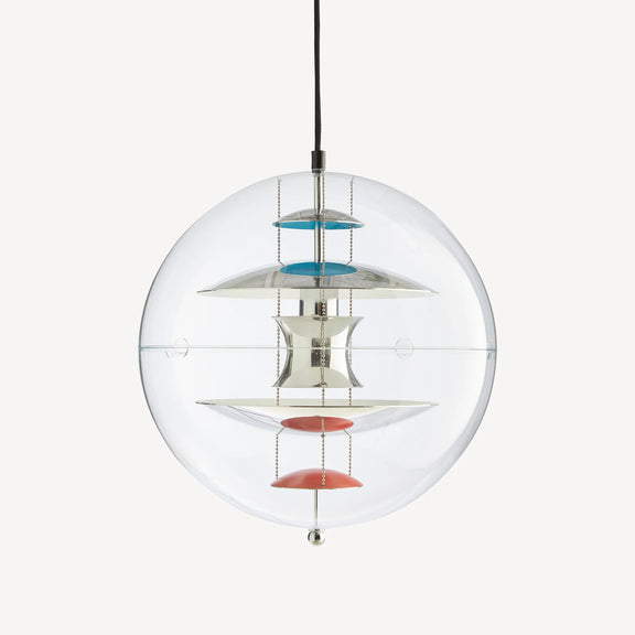 O pendente decorativo VP Globe Brass apresenta uma esfera externa de acrílico transparente cristalino com cinco refletores internos de acabamento em latão suspensos por três correntes de aço. Os refletores de acabamento em latão conferem um toque dourado à lâmpada, enquanto toques de vermelho e azul adicionam os retoques finais ao design escultural futurista, destacando o inconfundível DNA de design de Panton. Com o VP Globe, a ambição de Panton era projetar uma lâmpada que pudesse chamar a atenção e unificar um ambiente, independentemente de estar pendurada sozinha ou em grupos. Isso torna o pendente uma escolha ideal para um corredor ou corredor longo, ou como um elemento escultural em um canto.